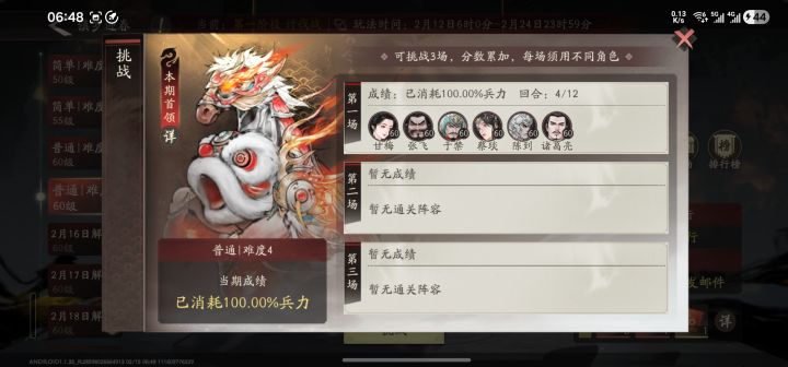 吕布,张飞,诸葛各带一队。要开始养成第三队,精通还没拉满,不过也够用了。活动关卡得手操,时间花费不长。但其中火焰铺地走格子,标识看也看不清。铺了两回合,基本就全覆盖了,然后还把游戏给卡死了。要不是能给抽副将的资源,真不想重启再打一遍~
