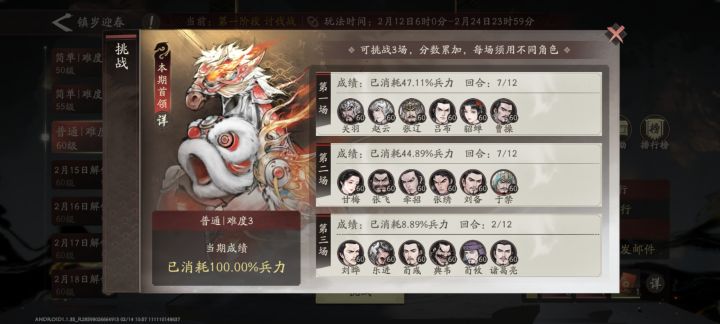吕布,张飞,诸葛各带一队。要开始养成第三队,精通还没拉满,不过也够用了。活动关卡得手操,时间花费不长。但其中火焰铺地走格子,标识看也看不清。铺了两回合,基本就全覆盖了,然后还把游戏给卡死了。要不是能给抽副将的资源,真不想重启再打一遍~