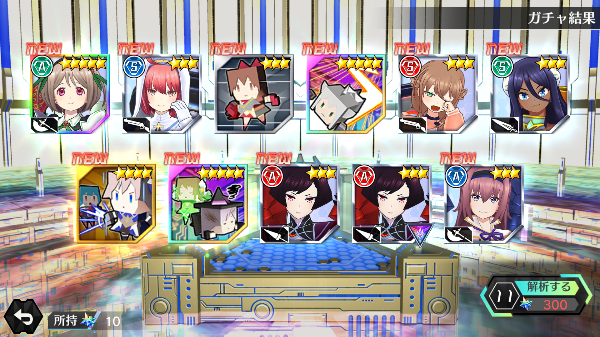 嗜睡枪萝莉一技能:扇形中距离近战攻击二技能:减伤回血三技能:小范围远距离圆形从上落下光雨,加中毒大招:长距离激光攻守兼备的一个角色巨乳双剑御姐一技能:360度近战旋转攻击二技能:远距离追踪自爆弹三技能:近战四段攻击,攻击完闪现回原位大招:多段打击死鱼眼蓝毛枪妹一技能:远距离光弹二技能:全体buff三技能:远距离束缚蛛网做几个新手就可以进行第二次十连