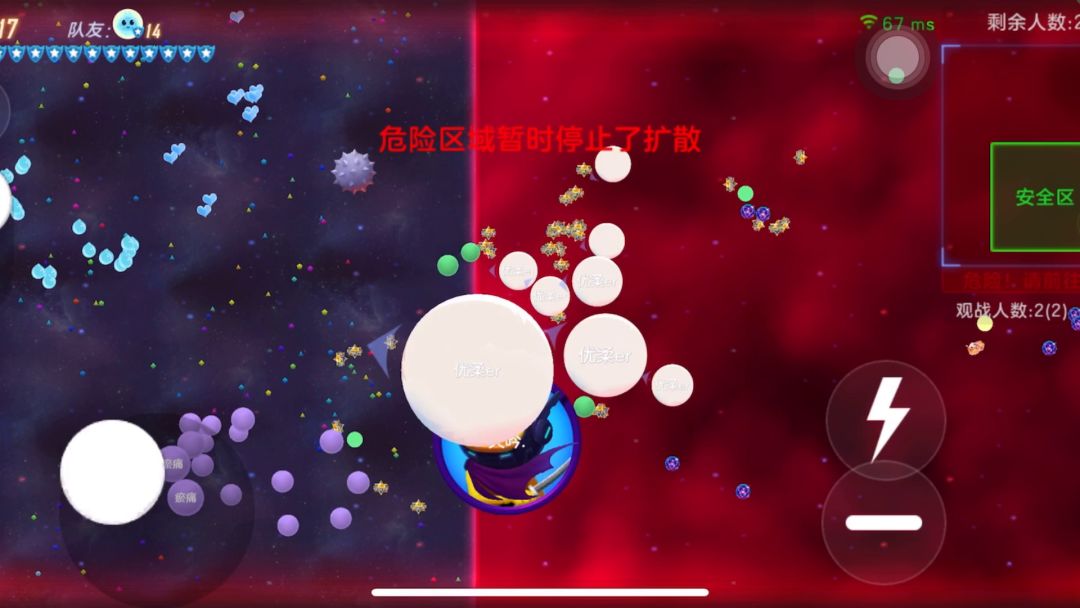 团战一定要团员一起齐心合作,可以分散,分组,找搭档,但是要根据团队排名,尽快找到团队中的大佬,站好队形。 1.不要一被跟自己一样大或者比自己大一圈的对手追就往角落跑,往中心圈跑,不然被逼到角落对方队友疯狂和球就over了。 2.被追的时候千万不要自裂成1/2直接被对方一口吞over。 3.被追时最好和他慢慢耗,他吃不掉你你吃不掉他。 4.团队搭档可以去推刺球扎对方主力,削弱它,从而完成反杀。 团战