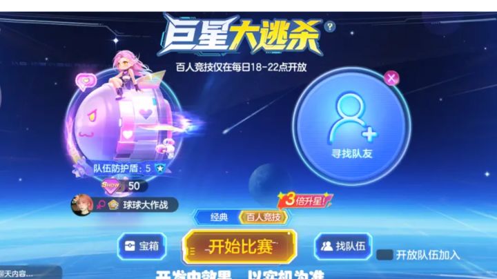 1秒极速开战?百人在线角逐?巨星大逃杀,这次动真格了!11月21日起,每晚18:00-22:00!百人巨星大逃杀燃情开战!助阵嘉年华!段位3倍升星,奖励更丰富!真·史诗级·竞技大场面,它来了!▲开发中效果,以实机为准▲ 爽玩花式,开局就战!大神云集,你能否杀出重围,问鼎巅峰?百“球”竞技,血战到底!百名球宝同台竞技,玩的就是真实!战斗即是发育!够格的“球”才能生存到底!更刺激!更激烈!生存