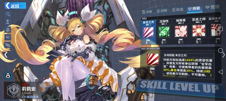 hello大家好这里是机师个人测评!时值2月我也是按照约定更新了莉莉安的一体机测评,本来这次没什么必要测评的毕竟一出场就是UR的机师嘛,但是本着给大家看看技能之类的思想和要换下哪个主c什么的还是做了一下测评。事不宜迟让我们来看看技能技能机制不复杂,就是新加入了女王之辉和女王之暗。两者都是伤害性的增益,二技能60%的增益非常暴力。总的来说5个技能都是为了增加伤害,伤害爆表。这次纷争地带请到了最难