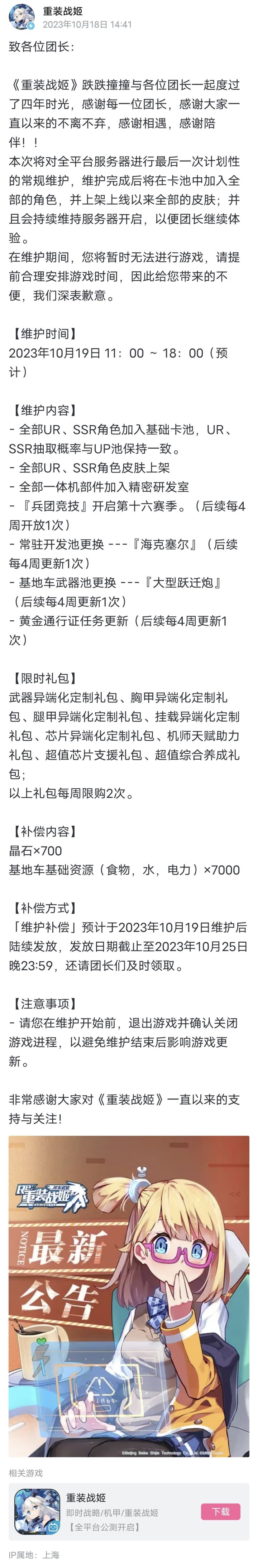 致各位团长:时光飞逝,一转眼《重装战姬》已陪伴了各位团长近四年的时间,这一路上,一起相伴的时光至今依然历历在目,我们衷心地感谢大家一直以来的支持与陪伴。虽然不舍,我们在此遗憾地宣布,《重装战姬》预计于6月29日进行最后一次新内容更新,后续一段时间我们将以复刻活动为主,活动期间团长们仍然可以正常体验游戏。为了给大家带来更好的复刻活动体验,我们计划从下次维护开始,在游戏内加大道具奖励的投放,调整