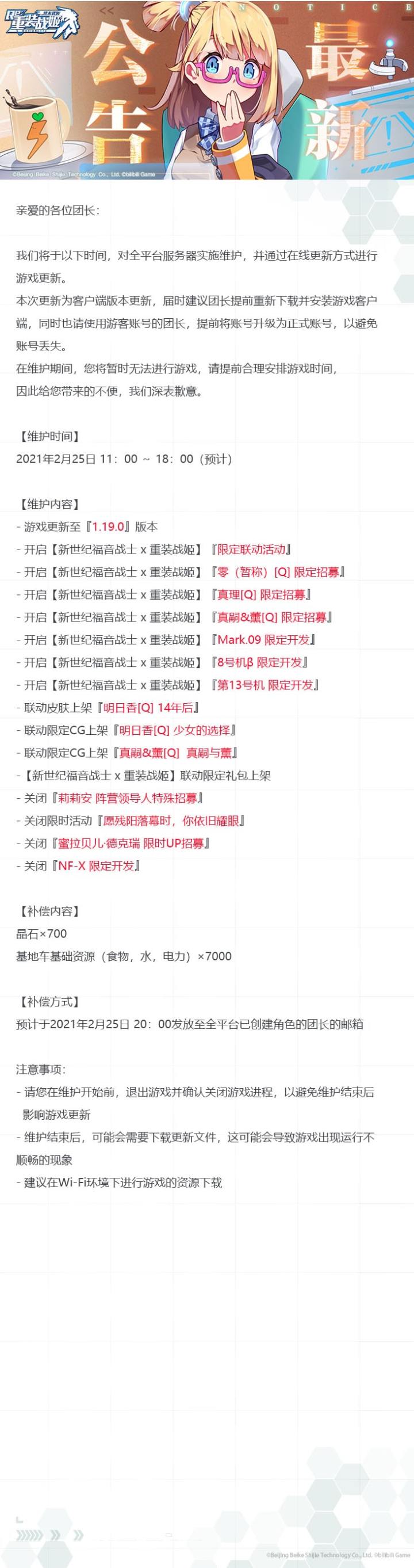 亲爱的各位团长:我们将于2月25日 11:00,对全平台服务器实施维护,本次更新为客户端版本更新,届时建议团长提前重新下载并安装游戏客户端,同时也请使用游客账号的团长,提前将账号升级为正式账号,以避免账号丢失。详细公告内容敬请查看下方图片。