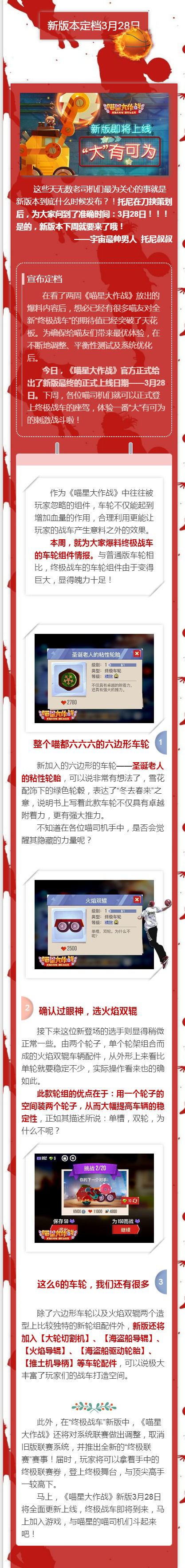 爆竹声中一岁除,春风送暖入屠苏。临近新年,各位老司机有没有感受到《喵星大作战》的浓厚新年氛围呢。我们的春节新版本发布后,各位喵星老司机们肯定升段无数,也获得了超多新战车、新武器~那就赶紧炫出你们的“无敌“战车吧!例:我的狂暴磐石,不服来战!!!埃菲珍妮芙#12144【活动内容】截图自己的主力战车,带上数值以及游戏名#游戏ID,回复该贴之下喵喵会从大家炫出的战车中随机抽取28位搭配最炫的奖