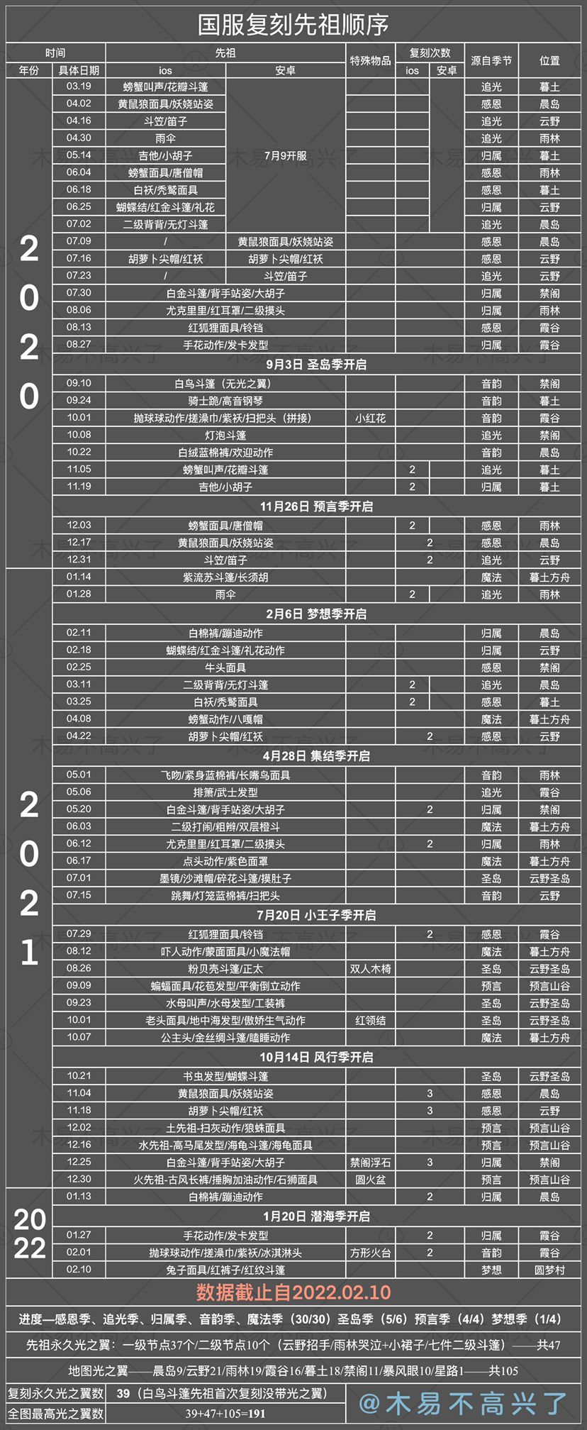 🔻现在双服最高光之翼191个 ---------------------- 复刻进度: 感恩季(6/6)✓ 追光季(6/6)✓ 归属季(6/6)✓ 音韵季(6/6)✓ 魔法季(6/6)✓ 圣岛季(5/6)缺连体裤 预言季(4/4)✓ 梦想季(1/4) 复刻永久光之翼39个 去年白鸟斗复刻没给光之翼 ---------------------- 地图内光之翼105个 晨岛:9 云野:21 雨林:19