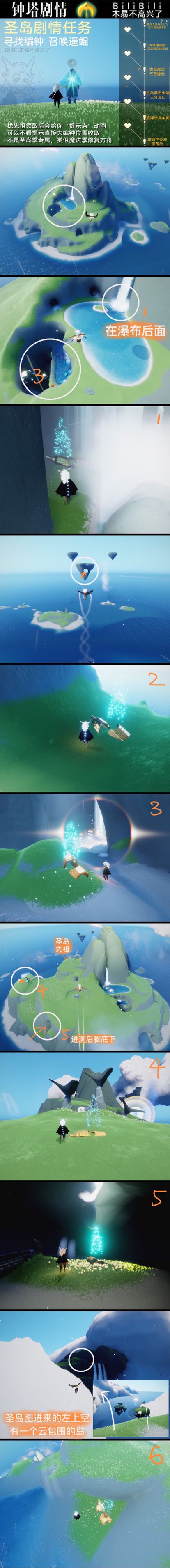 光遇圣中圣岛季的主要任务就是收集6个编钟,需要飞行至圣域群岛区域来收集所有的编钟,6个编钟的具体分布位置如下: 第一个编钟在圣域群岛大岛屿的瀑布下方,钻进瀑布的水流后就可以看到。 第二个编钟在圣域群岛空中岛屿中间的山洞里。 第三个编钟在大岛屿内部瀑布的附近。 第四个编钟在大岛屿侧面有三块石头的地方。 第五个编钟在大岛屿内部搁浅小船的旁边。 第六个编钟在圣岛最高的山顶上。