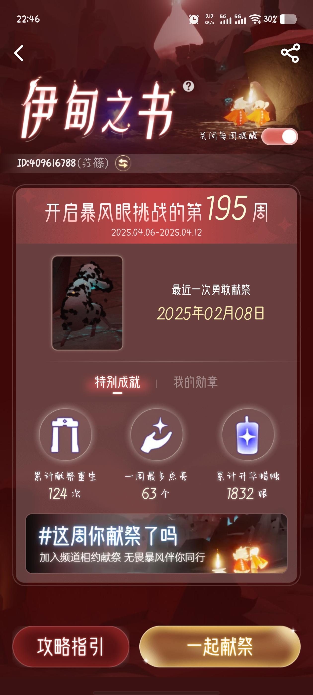 图片攻略提供者:微博sky光遇超话;作者:竟然是木子呀2月26号/ 周五(ios国服/安卓/同步) 图一:今日季节蜡烛(禁阁) 图二:今日大蜡烛(禁阁) 图三:今日任务详情 梦想季任务三开启/新增两个光翼/烛火堆 图四:复刻兑换图转载木易不高兴了啊 魔法商店免费领取:大只佬/小不点 25号中午12点复刻先祖降临/禁阁(四楼) ⭕️2月21——3月6日 68元:限时礼包:红色绒毛帽子 ⭕️2月14—
