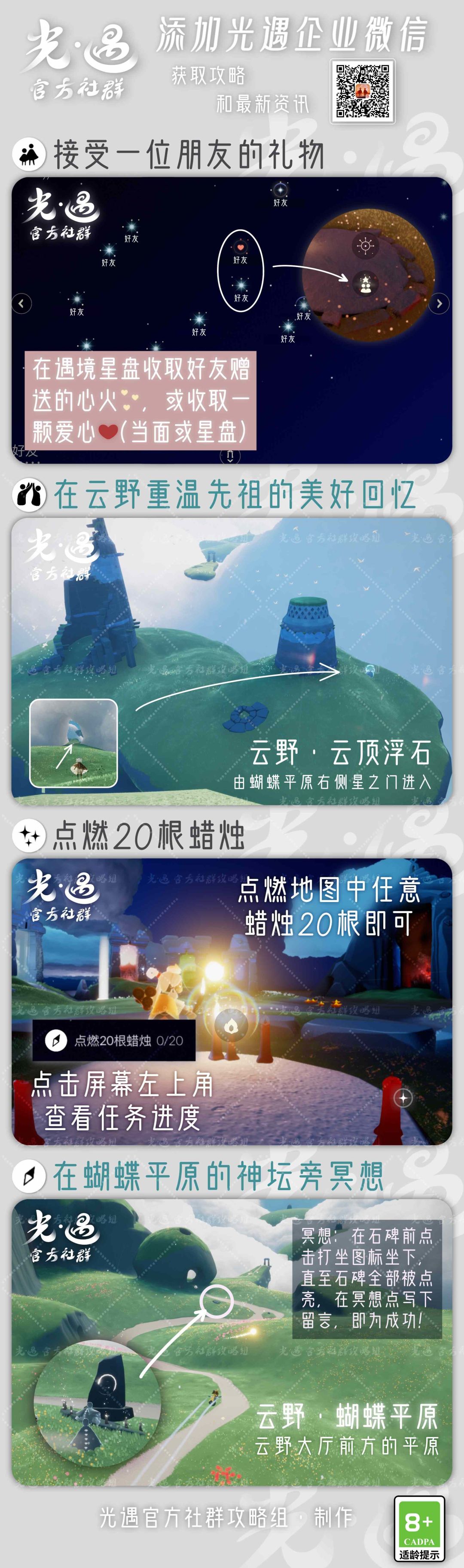 6.17每日任务+夜行季+旅行先祖 6.17日常任务攻略 ❣️p1 今日任务图解 〔①接受一位朋友的礼物〕 〔②在云野重温先祖的美好回忆〕云野·云顶浮石 〔③点燃20根蜡烛〕 〔④在蝴蝶平原的神坛旁冥想〕 🎊今日季节蜡烛位置图解(云野) 🌟今日大蜡烛位置图解(云野、雨林、暮土) 旅人休息区: 🎁今日免费魔法:长大成人&返老还童 💭夜行季季节任务五已开启 🔸 本周旅行先祖为情绪草药师~旅人们记得在周