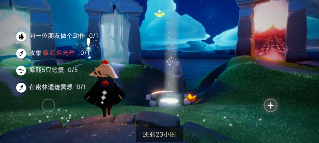 非原创,转发自微博:@今天游离翻车了吗 (周六原创更新) 一、1.向任意玩家鞠躬,小黑也行 2.今日绿色光芒云野右边隐藏图左边的小浮岛上(附①) 3.面对冥龙,最好在一龙图被照后快速卡动作栏的门 4.今日冥想雨林终点的湖附近参考上图 附① 二、今日季节烛火位置如上图所示 三、今日大蜡烛位置:禁阁一楼进升降梯右侧;升降梯背面(直走过升降梯);禁阁二楼四人门对面;终点右侧 未完待续