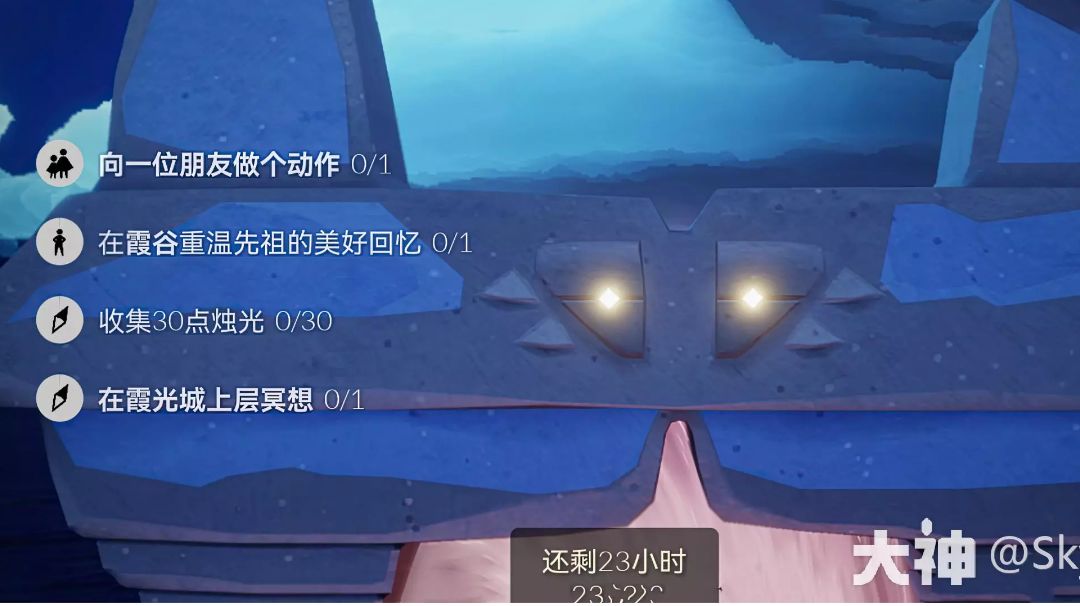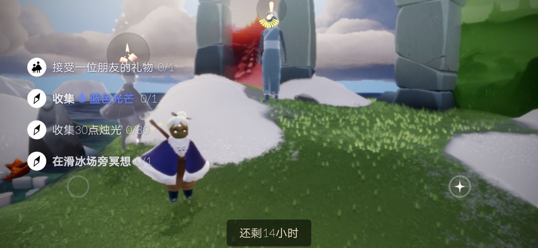 好饿好饿好饿( •̥́ ˍ •̀ू ) 任务 收礼(好友送的心火或心) 收集烛火 蓝光在霞谷冰面 冥想点在霞谷冰面山丘上 季节蜡烛 霞谷交友区 霞谷冰面桥上 霞谷冰面山丘 霞谷冰面滑雪赛道入口