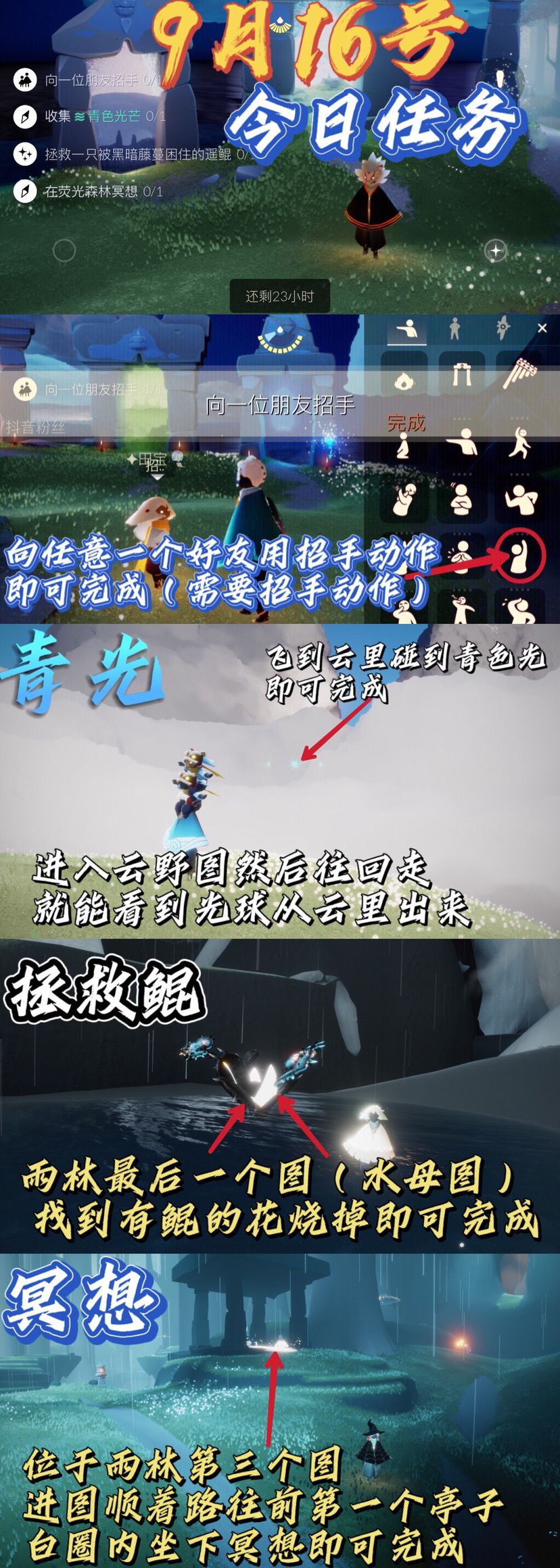 今天我大学开学,这个可能会很忙,所以今天我也会加上微博大佬@今天游离翻车了吗的攻略后面几天我也会转发她的(不全原创今天) 1.在云野三塔图找任意双人门,和好友或者偶遇其他光之子一起开门 2.在雨林大厅刚下去的图飞起来触碰它的头 3.在墓土图一,螃蟹🦀窝旁边长按自己大叫,直到完成 4.8/8人图,5如左侧小亭子里 5.如上图所示今日季节烛火位置 6.今日大蜡烛位置如上图所示 7.对比图 8.对比图 注