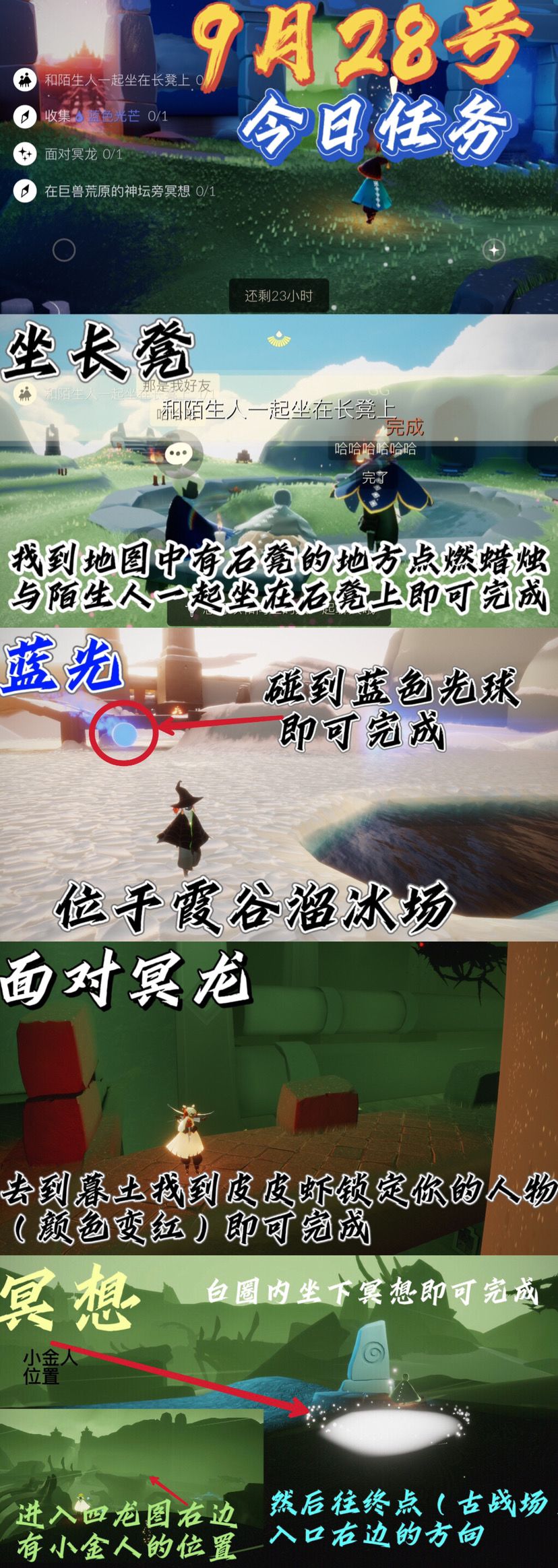 《光遇》游戏中每天的每日任务及大蜡烛的位置都不相同,玩家完成每日任务及收集大蜡烛都可以得到丰厚的兑换奖励,奖励可以用于兑换各种动作及道具,不过很多小伙伴不知道每日任务怎么做,又懒得自己去找大蜡烛的位置,我们汇总了每日任务的完成攻略以及蜡烛位置,一起来看看吧! 图1 今日季节蜡烛位置(霞谷) 图2 今日任务详解 图3 今日大蜡烛点(全图) 图4 近期活动日历 =『每日任务』= 「向一位玩家鞠躬」面向