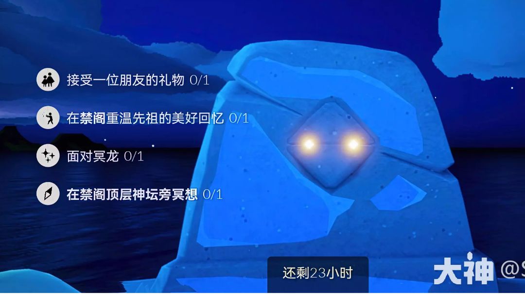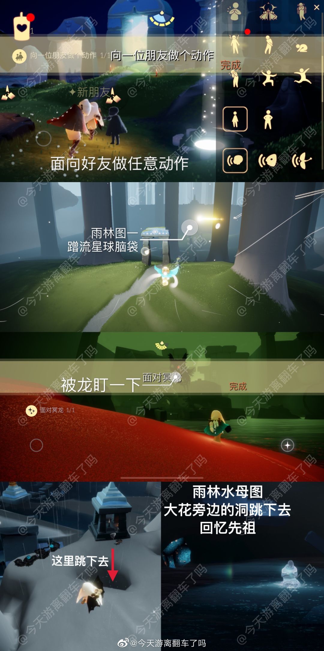 转自微博:今天游离翻车了吗 ① 今日季节蜡烛(霞谷) ② 今日任务详解 =『每日任务』= 「二人合力开门」开启一道双人门 「在霞谷重温先祖的美好回忆」霞谷终点神庙内,左边隐藏光门里 「面对冥龙」被龙盯一下让它目光从蓝变红「在霞光城拱门冥想」在进入霞光城地图后,霞光城主体建筑入口城门上方的石碑前光圈处打坐并留言 ③ 今日大蜡烛点(雨林禁阁) ④ 集体复刻预估兑换树 ⑤ 本周四复刻预估兑换树 ⑥ 近期