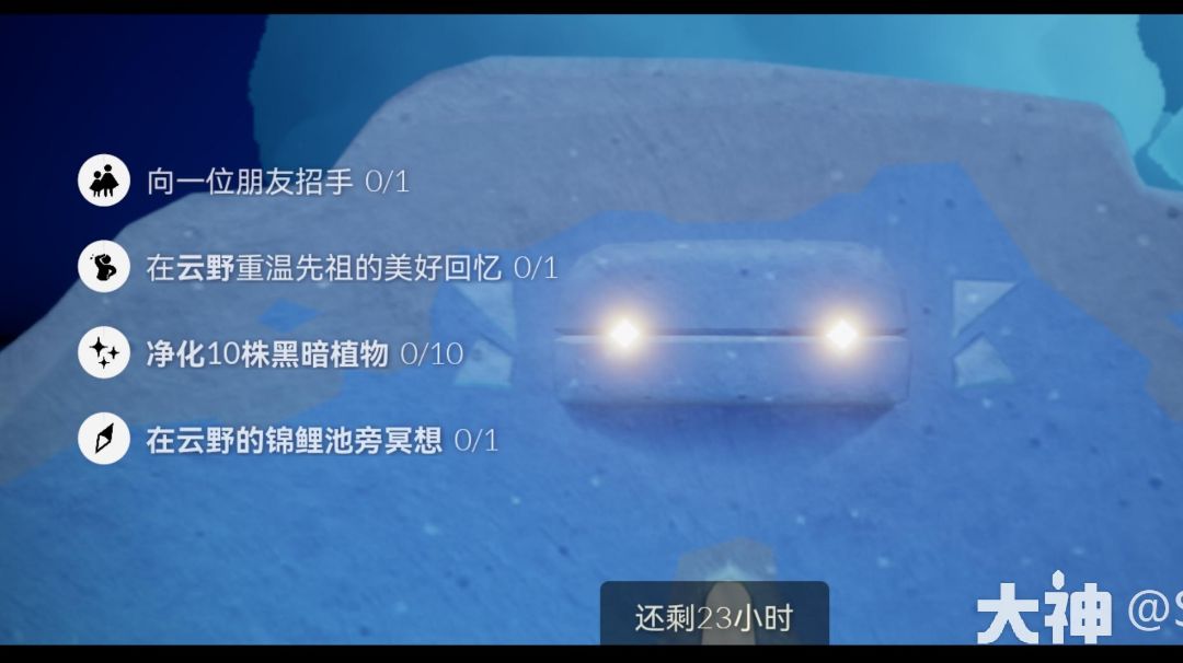 =『每日任务』= 「二人合力开门」开启一道双人门 「在云野重温先祖的美好回忆」云野圣岛 「面对冥龙」被龙盯一下让它目光从蓝变红 「在云顶浮石冥想」在云野右侧隐藏图左边残楼前实心建筑旁的石碑前光圈处打坐并留言 转自微博:今天游离翻车了吗