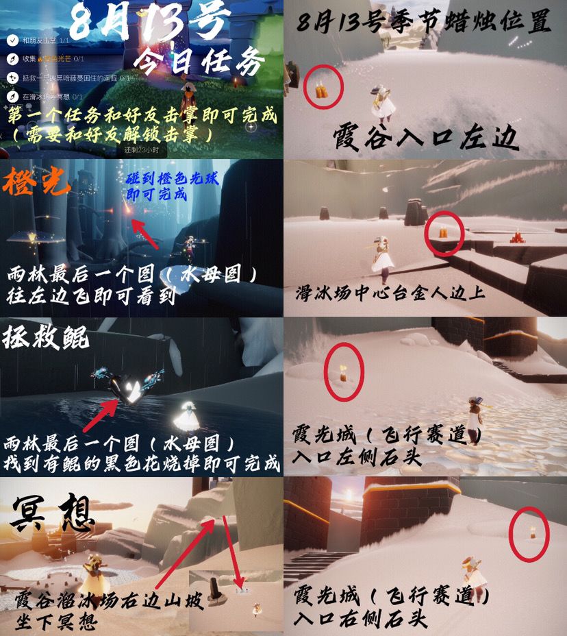 转自微博:今天游离翻车了吗 ① 今日季节蜡烛(雨林) ② 今日任务详解 =『每日任务』= 「给一位朋友送礼」送出一颗心 「在雨林重温先祖的美好回忆」雨林水母图前左边树枝分叉路,被砍掉的树干左边 「拯救一只遥鲲」烧掉困住遥鲲的花 「收集橙色光芒」雨林水母图前左边分叉路(高台小金人附近) ③ 今日大蜡烛点(雨林暮土禁阁)