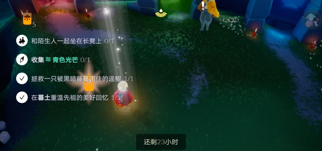和陌生人坐长凳(暮土可能有蜡烛的凳子相对多点,当然也可以云野隐藏图这些地方) 青色光芒(进入云野图之后向后走)