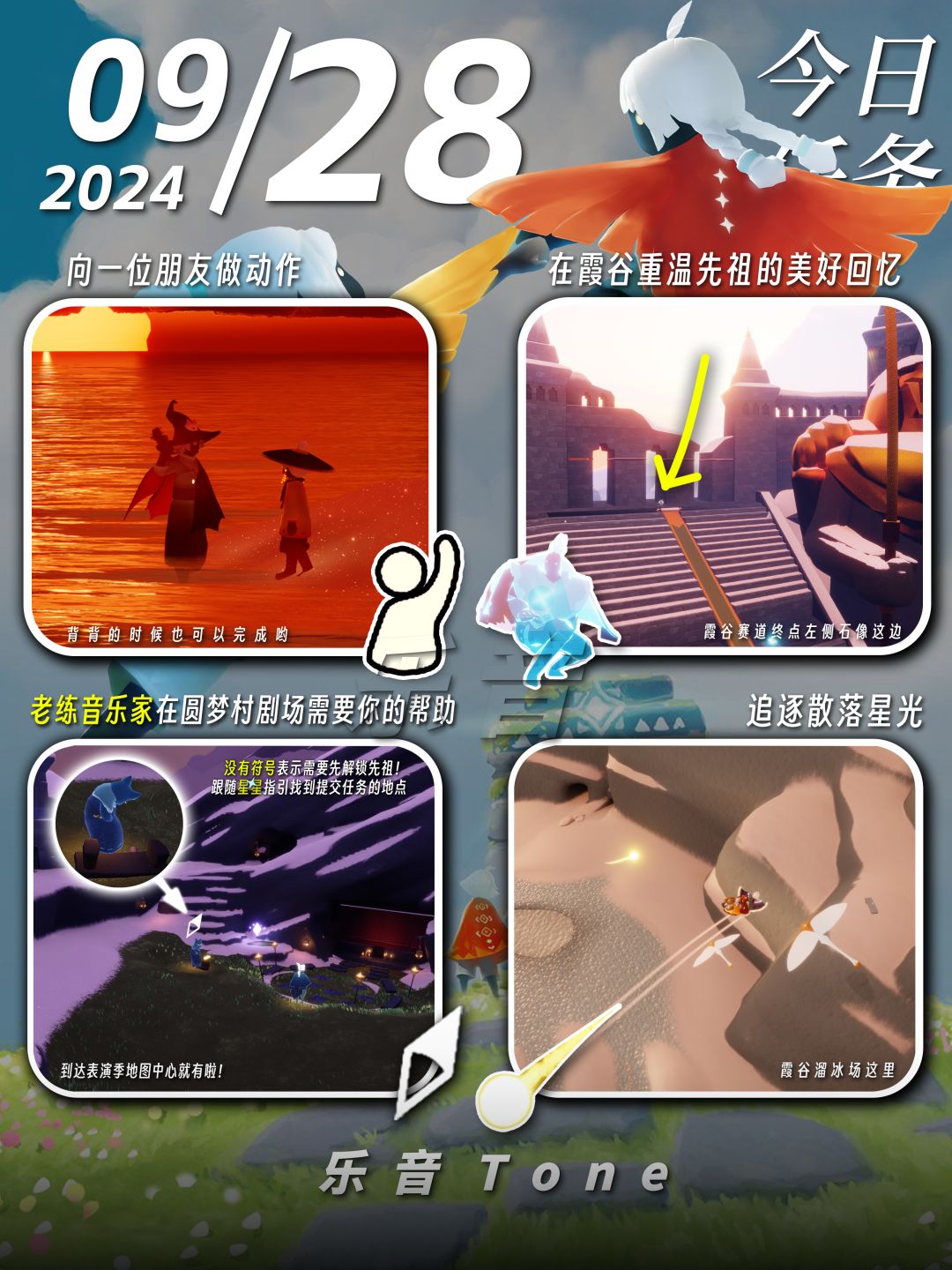 2024年9月28号 Sky光遇9月28日今日任务 #光遇每日任务# #图文攻略# #光遇# 今日任务/季蜡/大蜡/大蜡图/二重奏季/秋宵节/中秋节 ⚠️最后一天活动就要结束啦!!!秋宵节活动开始就全勤的光崽可以躺平啦!!不用再拿代币啦!不过可以去挂机烛火,以及有陌生人坐板凳任务时候可以去!! 凌晨咯~又到了万众期待的每日攻略时间!!!今天的安利歌曲是:《来世で会おう - 酸欠少女さユり (Say