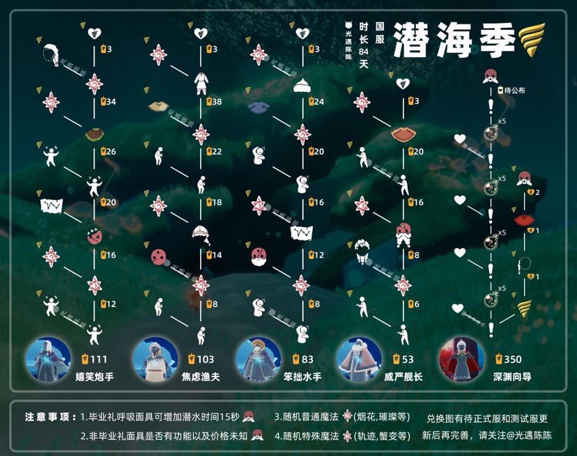 大家好呀,这里是陈陈 新季节潜海季即将开启! 这次我们将前往暮土新地图掌握新的技能——潜水 和先祖们一起前往海底探寻奇珍异宝 不过海洋深处也潜藏着危险... 嘘......它们来了!!! 一、季节物品兑换图: (部分内容及数据官方目前尚未公开,会持续更新) 二、潜水技巧详细教学: 三、先祖收集: 四、光翼收集: 五、季节任务: 六、全动作展示: 七、季节物品展示: 1.向导先祖: 2.威严舰长: 3