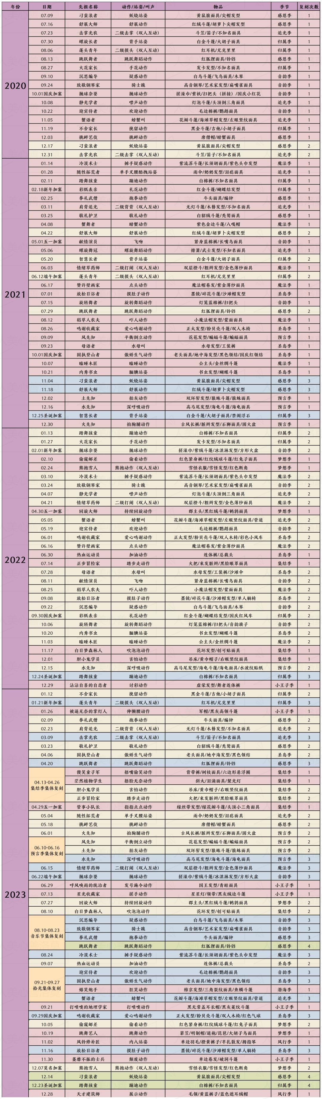 还是勤快地汇总复刻了[表情_歪嘴笑]看习惯了(之前弄过一部分 🌸格式参考了@木易不高兴了的汇总图 🌸先祖及物品名称参考了官方帖及vx小程序sky旅人攻略手册(但有一些面具和发型实在是不知道叫什么,我编上的) 🌸颜色按照复刻次数区分(换了个配色,感觉比之前好看了[表情_歪嘴笑] 以前整理复刻是为了方便预测,但是现在暂时不打算预测了,整理出来以后用到再说[表情_吐舌头] 本来之打算有空按季节顺序整理一