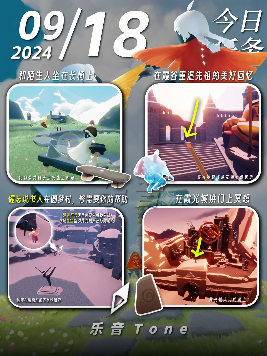 2024年9月18号 Sky光遇9月18日今日任务 #光遇每日任务# #图文攻略# #光遇# 今日任务/季蜡/大蜡/大蜡图/二重奏季/秋宵节/中秋节 凌晨咯~又到了万众期待的每日攻略时间!!!今天的安利歌曲是《マニマニ - 7co》 如果歌曲因为声音不可用就会采用上一首!但是安利的歌曲不变~~!! 1⃣中秋节活动来啦!——秋宵节 ⌛2024.9.15-2024.9.28 每日可获得代币:5枚 组成