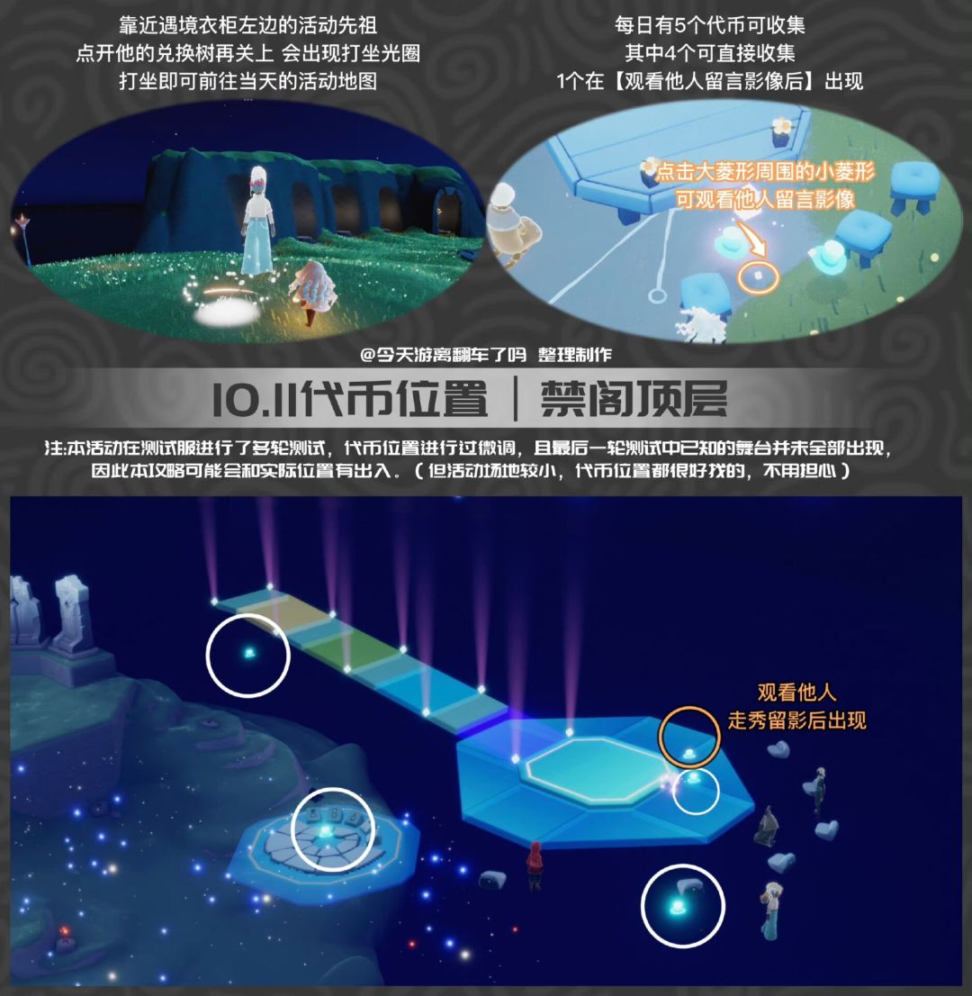 《光遇》游戏中每天的每日任务及大蜡烛的位置都不相同,玩家完成每日任务及收集大蜡烛都可以得到丰厚的兑换奖励,奖励可以用于兑换各种动作及道具,不过很多小伙伴不知道每日任务怎么做,又懒得自己去找大蜡烛的位置,我们汇总了每日任务的完成攻略以及蜡烛位置,一起来看看吧! ① 今日季节蜡烛(禁阁) ② 今日周年票位置(共6个点可得11张票) ③ 今日任务详解 ④ 今日大蜡烛点(云野雨林暮土) ⑤ 可能的落石点(