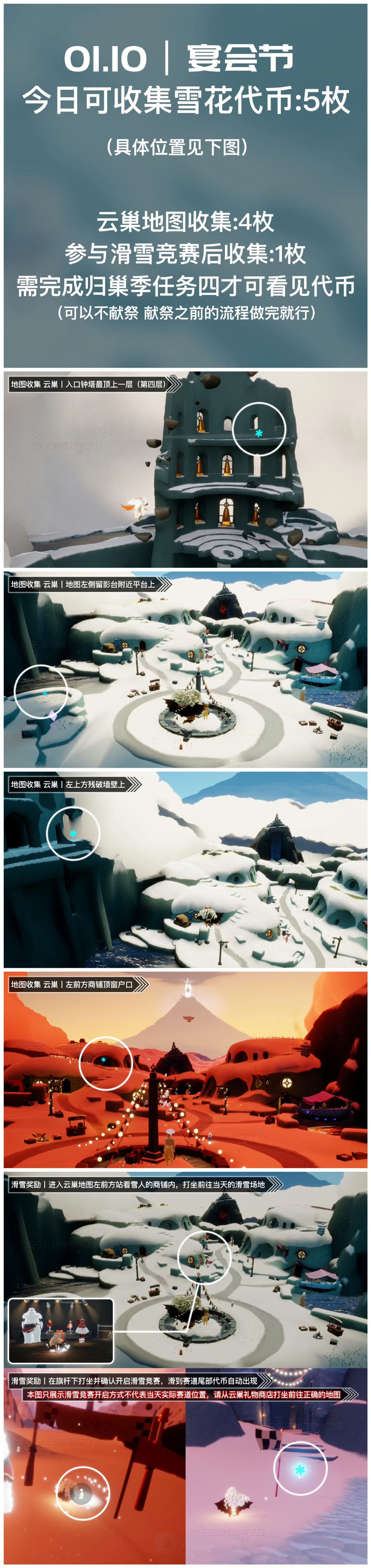 《光遇》游戏中每天的每日任务及大蜡烛的位置都不相同,玩家完成每日任务及收集大蜡烛都可以得到丰厚的兑换奖励,奖励可以用于兑换各种动作及道具,不过很多小伙伴不知道每日任务怎么做,又懒得自己去找大蜡烛的位置,我们汇总了每日任务的完成攻略以及蜡烛位置,一起来看看吧! 图1 今日雪花代币位置 图2 今日任务详解 图3 今日大蜡烛点(云野雨林暮土) 图4 宴会节兑换树、物品兑换位置 图5 可能的落石点(图示位