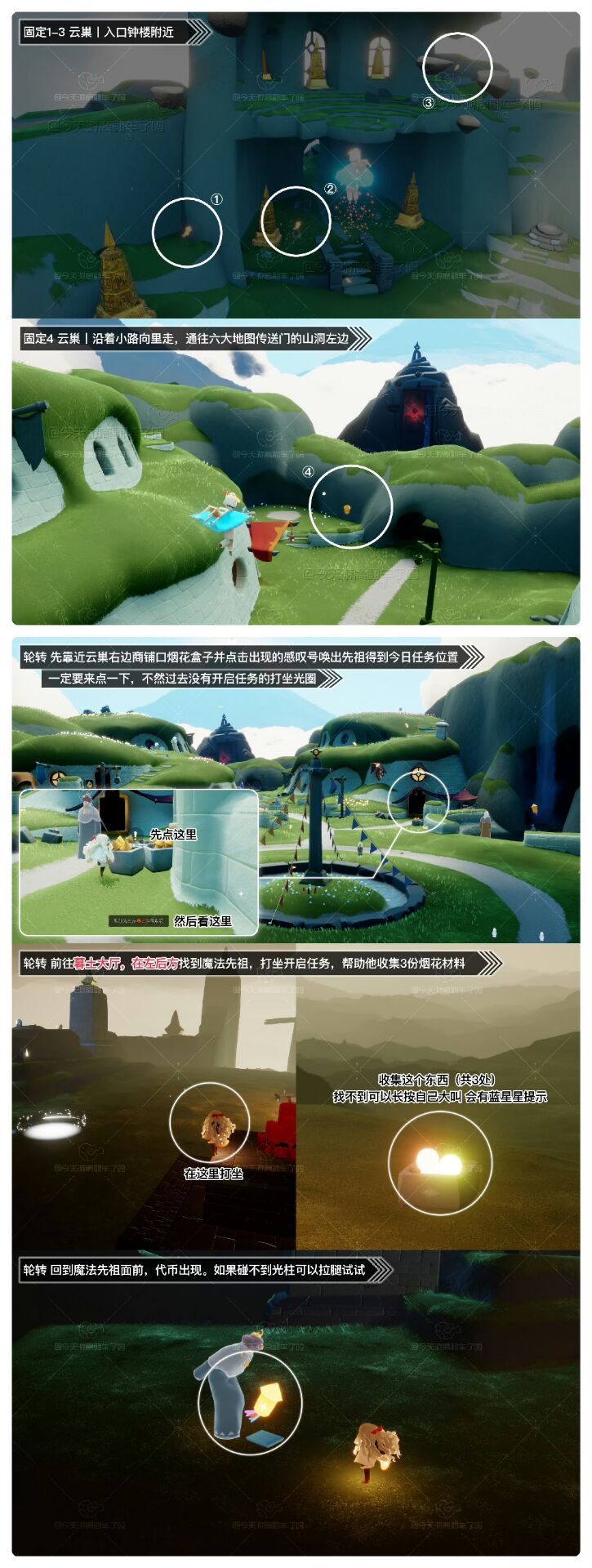 《光遇》游戏中每天的每日任务及大蜡烛的位置都不相同,玩家完成每日任务及收集大蜡烛都可以得到丰厚的兑换奖励,奖励可以用于兑换各种动作及道具,不过很多小伙伴不知道每日任务怎么做,又懒得自己去找大蜡烛的位置,我们汇总了每日任务的完成攻略以及蜡烛位置,一起来看看吧! 图1 今日烟花代币位置 图2 今日季节蜡烛(禁阁) 图3 今日任务详解 图4 今日大蜡烛点(云野雨林霞谷) 图5 烟花大会攻略图(含兑换物品