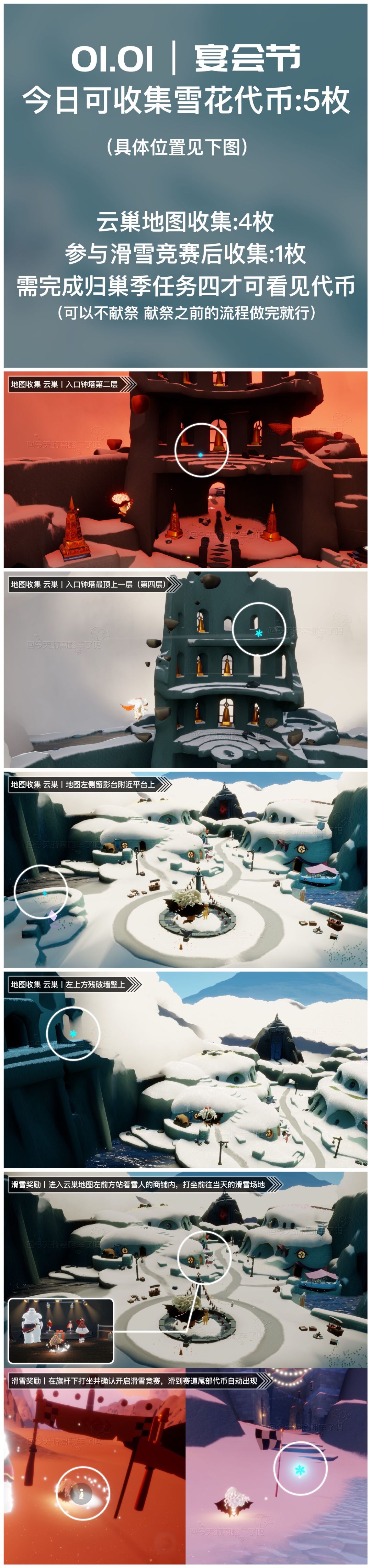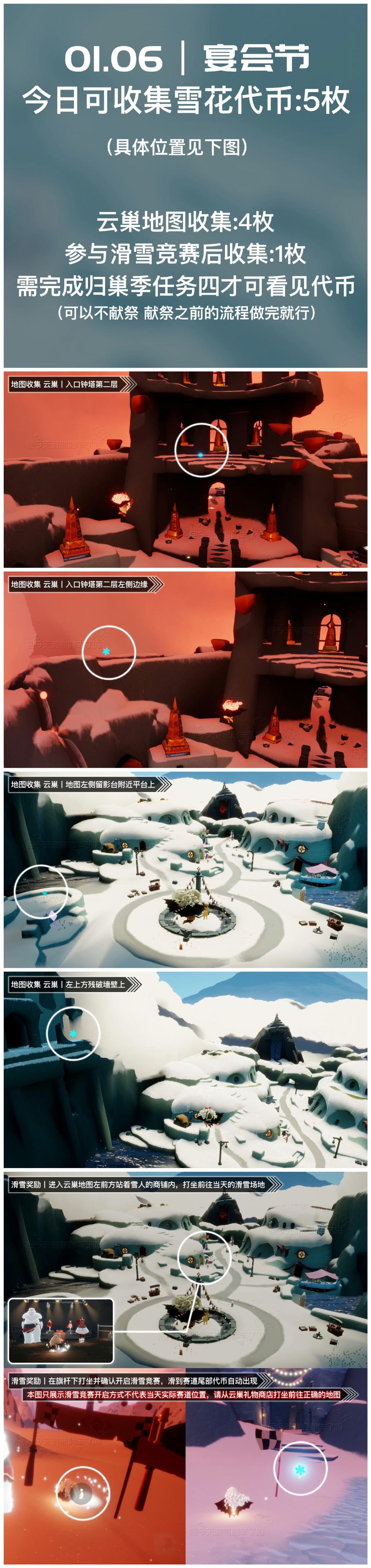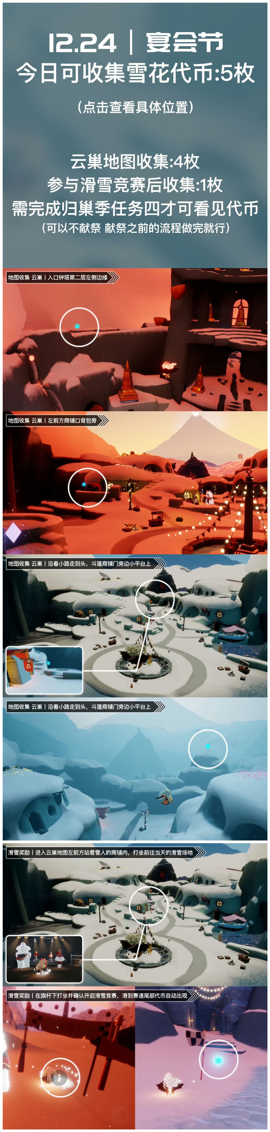 《光遇》游戏中每天的每日任务及大蜡烛的位置都不相同,玩家完成每日任务及收集大蜡烛都可以得到丰厚的兑换奖励,奖励可以用于兑换各种动作及道具,不过很多小伙伴不知道每日任务怎么做,又懒得自己去找大蜡烛的位置,我们汇总了每日任务的完成攻略以及蜡烛位置,一起来看看吧! 图1 今日雪花代币位置 图2 今日季节蜡烛(霞谷) 图3 今日任务详解 图4 今日大蜡烛点(禁阁) 图5 宴会节兑换树、物品兑换位置 图6