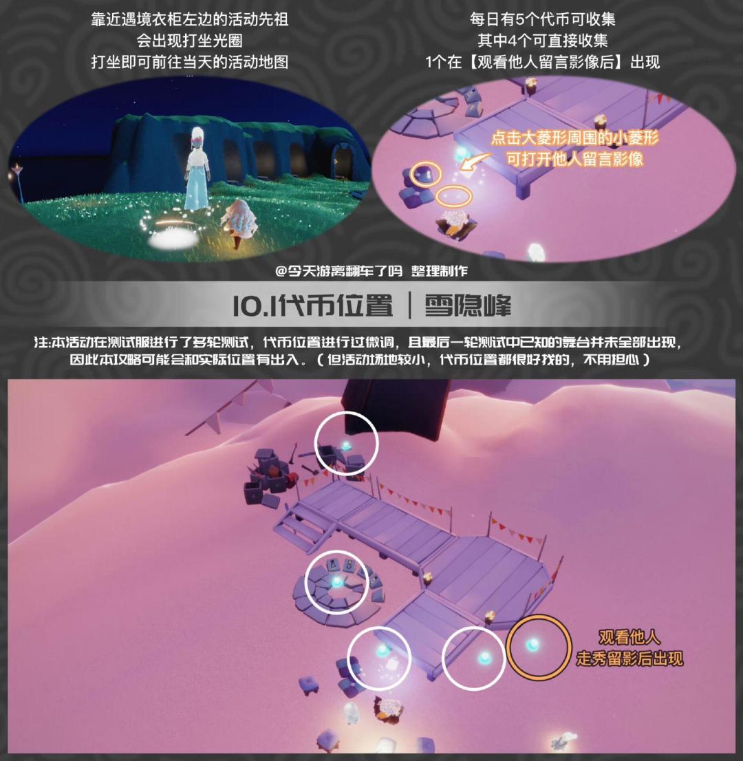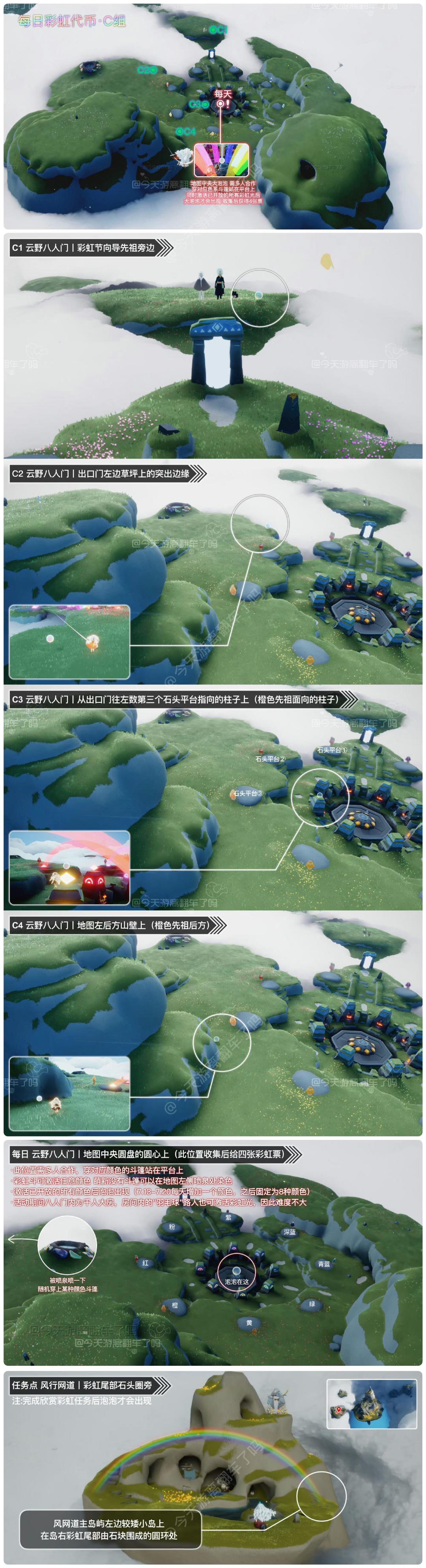 转自微博:今天游离翻车了吗 ① 今日季节蜡烛(云野) ② 今日任务详解 =『每日任务』= 「二人合力开门」开启一道双人门 「在云野温先祖的美好回忆」云野圣岛,主岛屿下方螃蟹洞内 「拯救一只遥鲲」烧掉困住遥鲲的花 「在云顶浮石冥想」在云野右侧隐藏图左边残楼前实心建筑旁的石碑前光圈处打坐并留言 ③ 今日大蜡烛点(雨林霞谷) ④ 近期活动日历 ⑤ 集体复刻预估兑换树 =『落石点』= 🈚今日无黑/红石 =