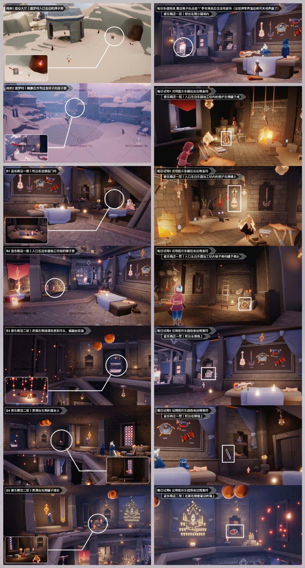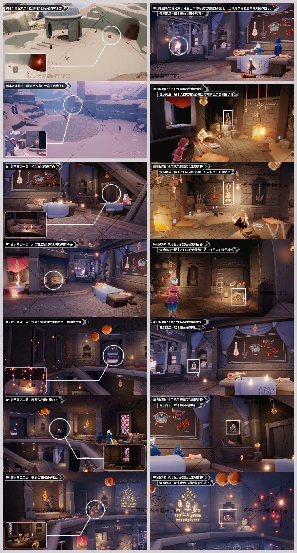 《光遇》游戏中每天的每日任务及大蜡烛的位置都不相同,玩家完成每日任务及收集大蜡烛都可以得到丰厚的兑换奖励,奖励可以用于兑换各种动作及道具,不过很多小伙伴不知道每日任务怎么做,又懒得自己去找大蜡烛的位置,我们汇总了每日任务的完成攻略以及蜡烛位置,一起来看看吧! 图1 今日音乐票位置 图2 今日季节蜡烛位置(禁阁) 图3 今日任务详解 图4 今日大蜡烛点(雨林暮土禁阁) 图5 可能的落石点(图示位置随