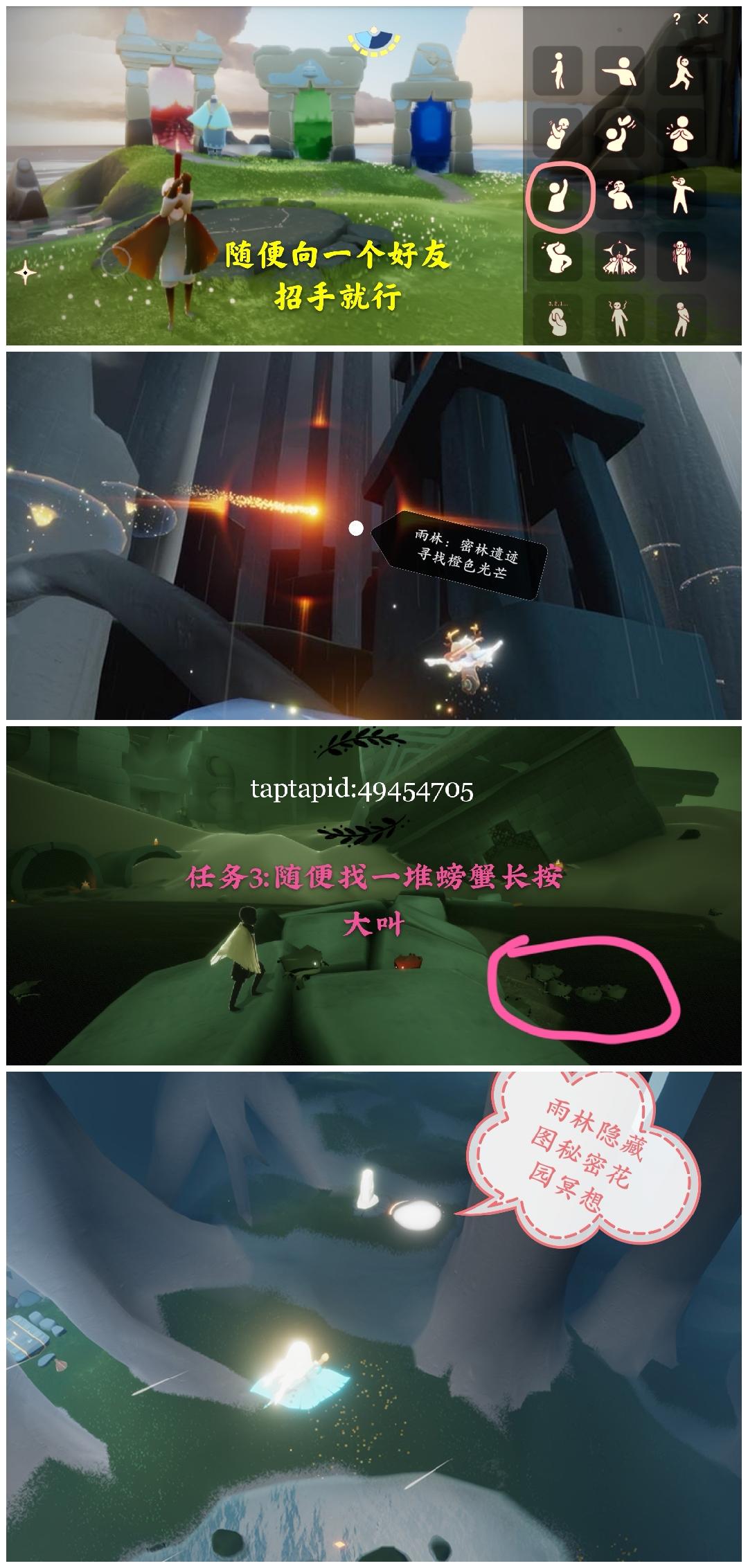 1.4每日任务及大蜡烛季节蜡烛位置 大蜡烛:暮土 季节蜡烛:雨林 回忆先祖在雨林二图 免费魔法:魔法烟花 p1任务图,p2季节蜡烛,p3大蜡烛 今天复刻先祖上午10点就要走了,别忘了兑换哦