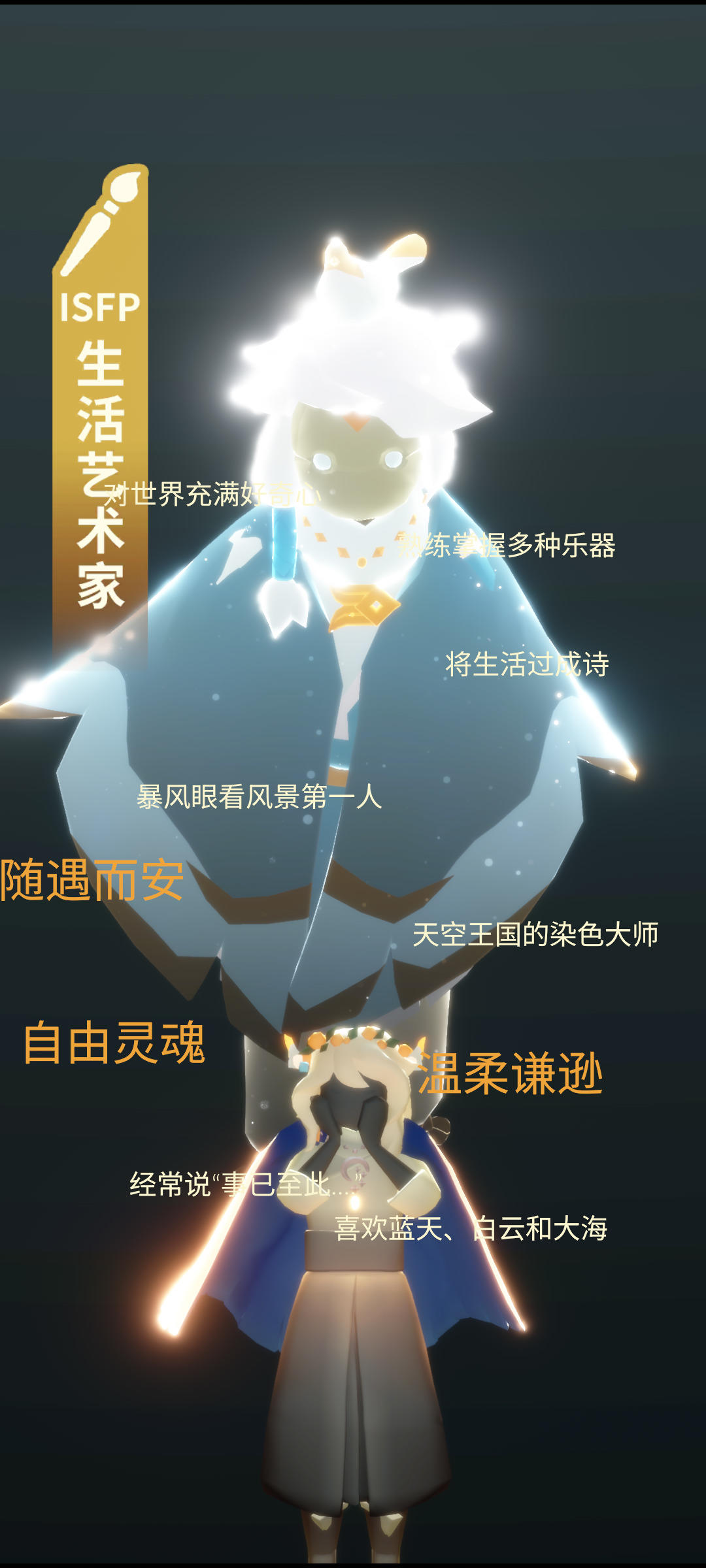 自介:女/09/173,会画一点画,水瓶座,infp,嘴毒,拧巴,脾气较稳定,有时候会EMO,内耗,会自我消化情绪,喜欢占有欲强的,孤狼,上线会主动传,一般晚上在线,晚上10点会去老奶奶那吃饭,有点慢热,不要住宿生,不要体验卡,不要钓鱼,不要淡游的,要经常玩,可以带你跑图做任务#sky光遇 #光遇交友