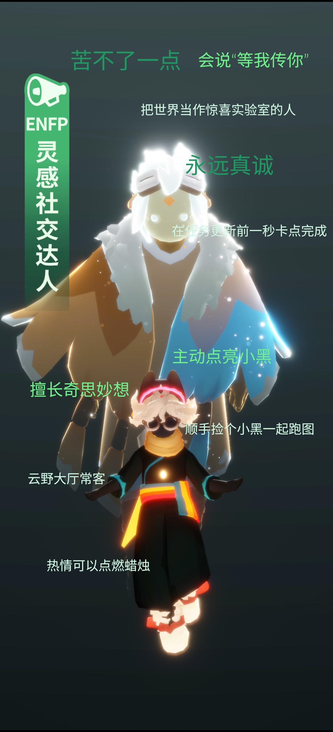 我比较肝,跑图任务献祭不在话下,假期期间可以带你跑跑图,做做任务。但是我很慢热,熟了话多。我圈子小,算是孤狼,只有一个退游崽崽和一个不固定在线的监护玩的熟。我希望固玩能和我多多说话,多多和我玩,能更好的提升彼此的关系。好朋友多的光崽不用加我,好友多我玩不到一起。总结:固玩的要求,希望能一对一,话多,热情,主动跟我玩😊😊如果话不多,我可能一开始跟你就很冷淡,但是熟了之后绝对不会冷淡你,如果有