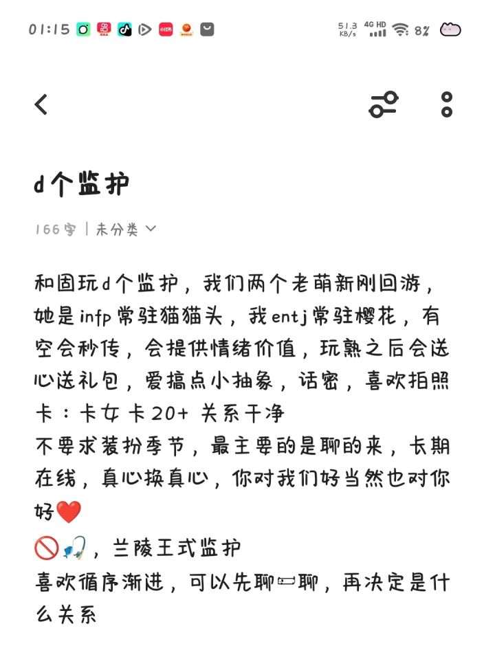 1.什么关系都行,只要能叫上线。一个人上线太无聊,想有个上线的动力,所以我可能会像每天打卡任务一样催你上线。 2.我应该属于半萌新,因为中途好友们都不玩了,所以觉得没意思,也退游了,退了快两年,目前还记得的就是跑图路线、小金人位置、献祭路线。3.我一般晚上20-23点有时间,我可以带跑图、做任务、献祭,只要不嫌弃我漏火。 4.很多打卡点我都不记得了,但是想去的话我可以去重新学,我有两个号,可