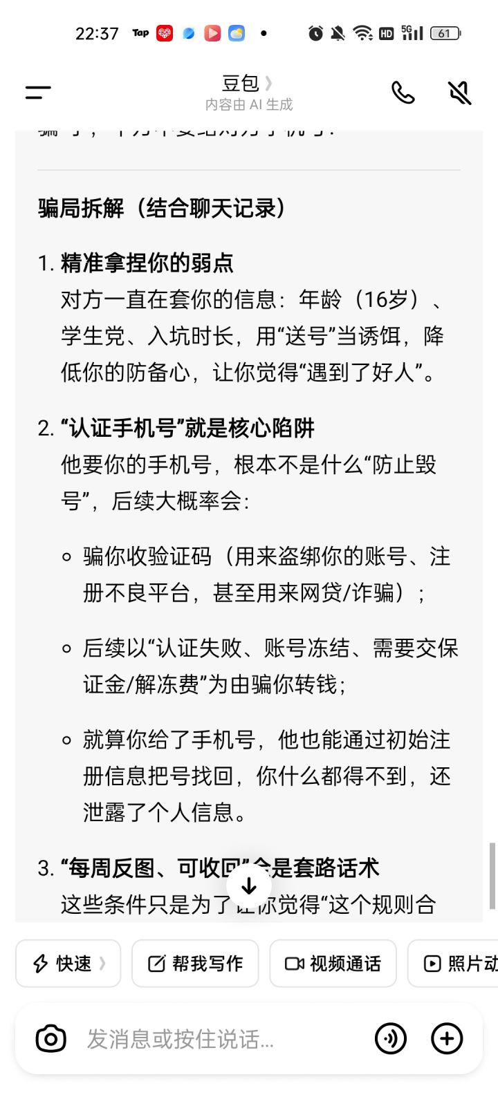 这个人说送账号,问一堆问题,幸亏我问了豆包,你们看截图,后面就直接拉黑我了