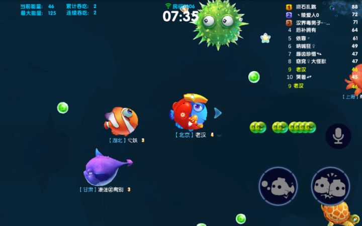 在《海底大作战》游戏中玩家扮演着一条徜徉在美丽的海洋世界的鱼,随着吞食海中的鱼食而逐渐变大,可以吃掉比自己小的其他玩家来让自己快速成长,但也小心周围伺机而动的大鱼。虽然体型越大速度越慢,但也绝不能掉以轻心,不小心就会吃大亏。首先,便是一开玩便告诉你的:当你的战鱼比对方的战鱼大一倍以上,就可以分身去吃他(她)的。延伸:可以再次分身来吃掉对方。当你被大鱼追击时,可以先吐出一些(大部分)能量,然后分