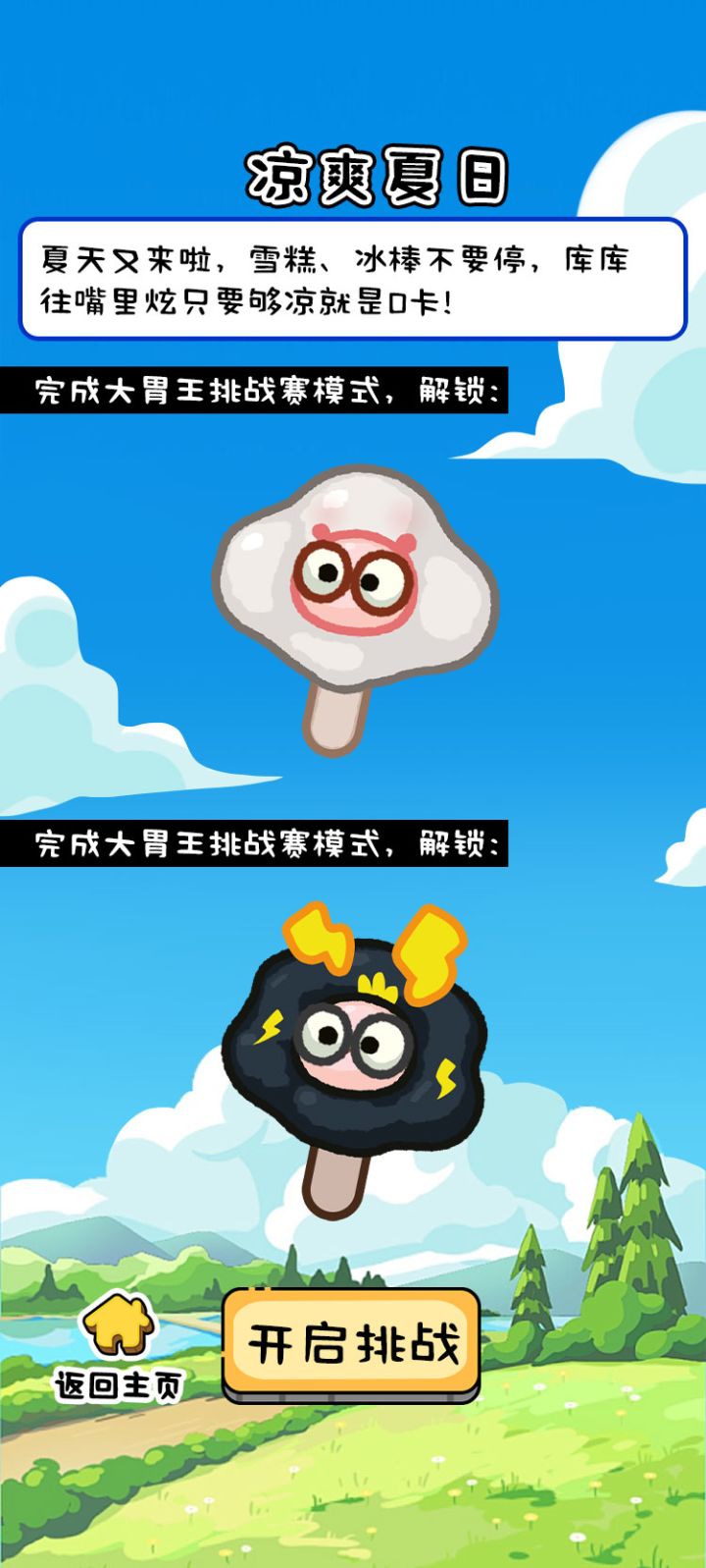 夏天又到了,冰棒,雪糕不要停,通关大胃王模式,赢取限量冰棍,雪糕皮肤哦。获取皮肤后,去美食DIY里面调整您的食物,让游戏焕然一新!#光吃不长肉
