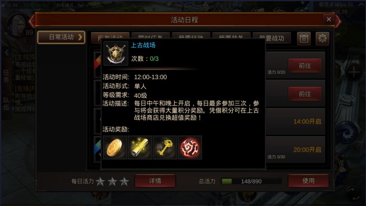 活动时间:周一至周日,12:00-13:00、20:00-21:00活动形式:单人活动等级:40级活动报名:1、“活动”图标,打开活动界面,点击上古战场,打开报名界面,进行预报名。2、每人每日可报名参与3场;3、进入战场前,系统会向您弹出邀请。4、报名成功后至战场开启前角色死亡后会取消上古战场的报名,并收到取消报名的邮件通知。活动介绍:分组规则:报名后,系统将根据玩家等级自动分