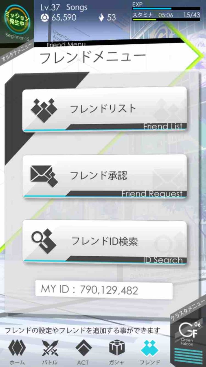 ID:790,129,482有不知道自己ID在哪的请看图一,主界面下面五个键,从右数第一个便是好友界面,好友界面内三个键最下面那个:フレンドID検索。就是输入ID添加好友的选项!PS:我是IOS的,不知道这游戏ios是否与Android 数据互通!总之大家不管什么系统都可以试下!