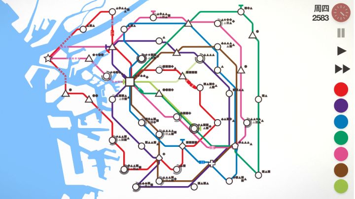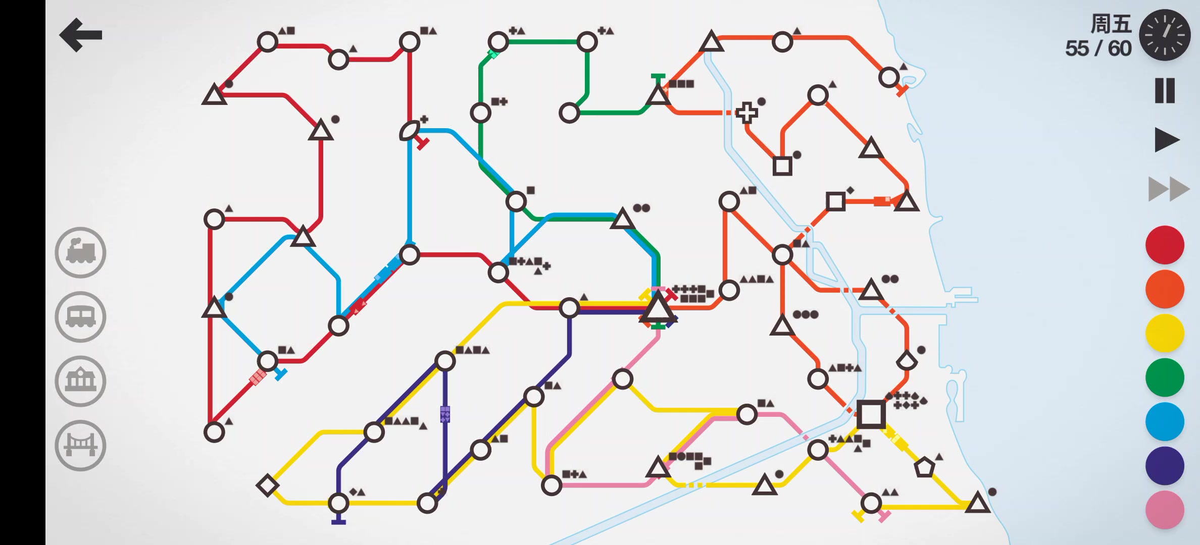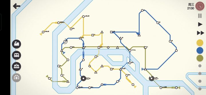 #模拟地铁付费下载版 终于玩通关了,还记得前期觉得超难,怎么都过不了,无法解锁下一关,500都到不了。到后来慢慢摸到诀窍,基本上每一关都能达到1200-1500。我也确实不是什么大佬把每一关挑战勋章拿到,但是也玩到最后啦,把我的心得分享一下1. 确保一条线有多种形状,最好三角形正方形圆形都有,这样减少换乘次数。2.换乘站点,特殊符号>正方形>三角形>圆形,无法满