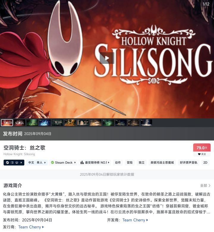 Team Cherry 已确认独立游戏《空洞骑士:丝之歌》将于 2025年9月4日 全球发售,定价 19.99美元(约142元人民币),较2017年前作(14.99美元)仅上涨5美元。考虑通货膨胀因素,实际涨幅仅约11美分:这一价格远低于当前3A游戏70-80美元的主流定价,在Steam愿望单量达480万的背景下尤显难得。Team Cherry工作室低定价策略,也侧面降低了体验门槛,可以说此举也获