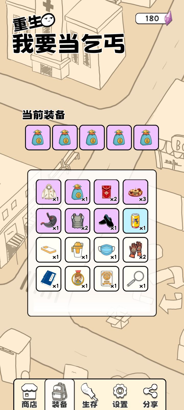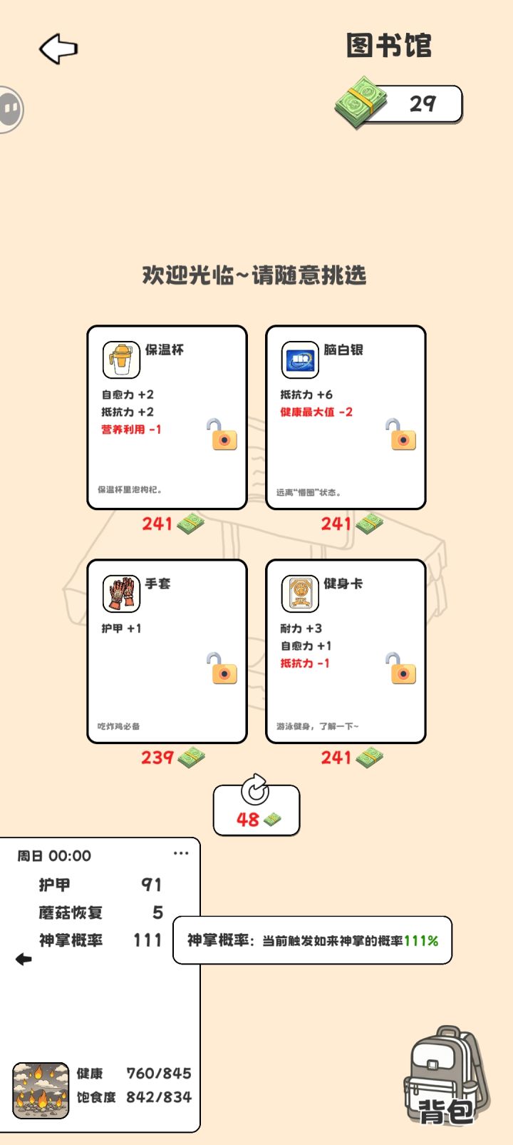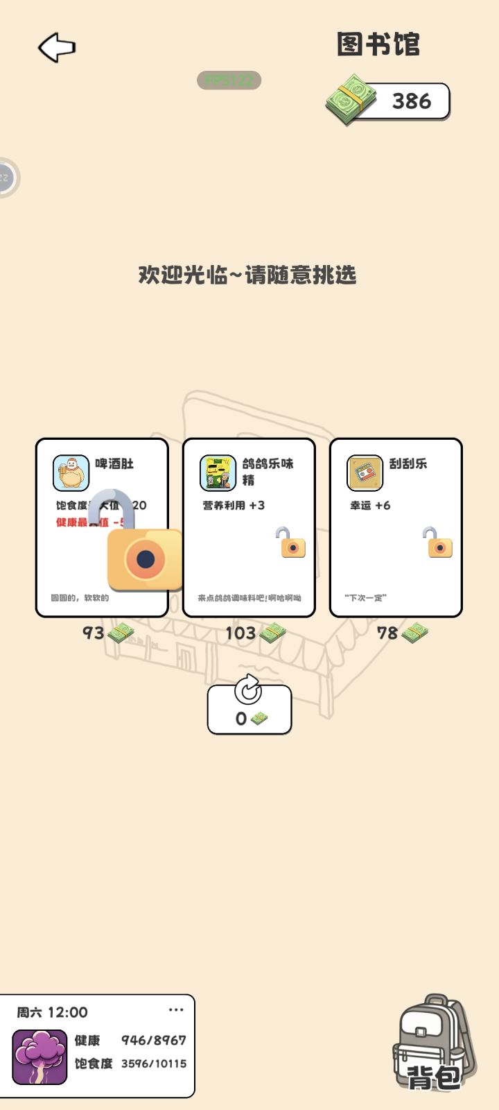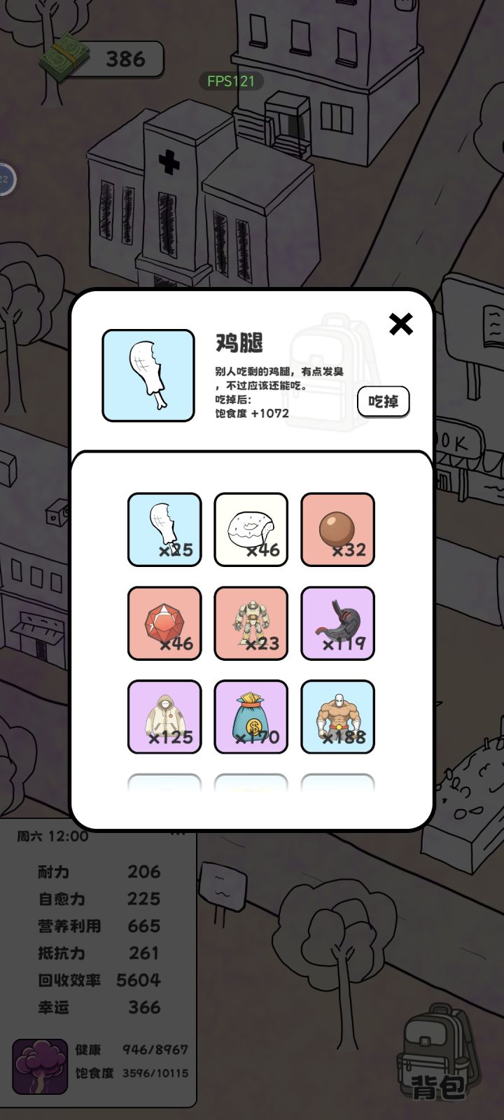 Black喵警长 : 我发现好多人差评说恢复饱食度只能看广告,不是的啊,你点开背包里面能吃的,注意营养利用和抵抗力,第一次通关很有用。蚂蚁出来就没什么用了,毕竟总共才10点饱食度。但是要主要不要买加健康减饱食度的,应该会game over,我没试过。