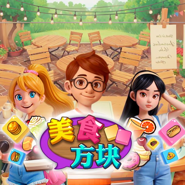 《美食方块》是一款竖版益智休闲类小游戏,游戏内容为以美食卡牌为题材的三消小游戏。场景主要包括:游戏主界面场景和游玩界面场景。主界面场景是一个三层的餐厅建筑,玩家需要去游玩游戏,获得金币资源用于建设餐厅。游玩界面即游戏核心玩法界面,首先,每次会有三个客人出现,每个客人需要三张相同的食材卡,在客人下方,会有多列食材卡牌叠加的卡柱,每次点击对应卡柱,则会选取卡住最上层的卡牌,如果符合其中一个客人要求,直接飞到对应的客人下面,如不符合,则会优先飞到公共等待区等待。当客人需求被满足时,则会消除卡牌。