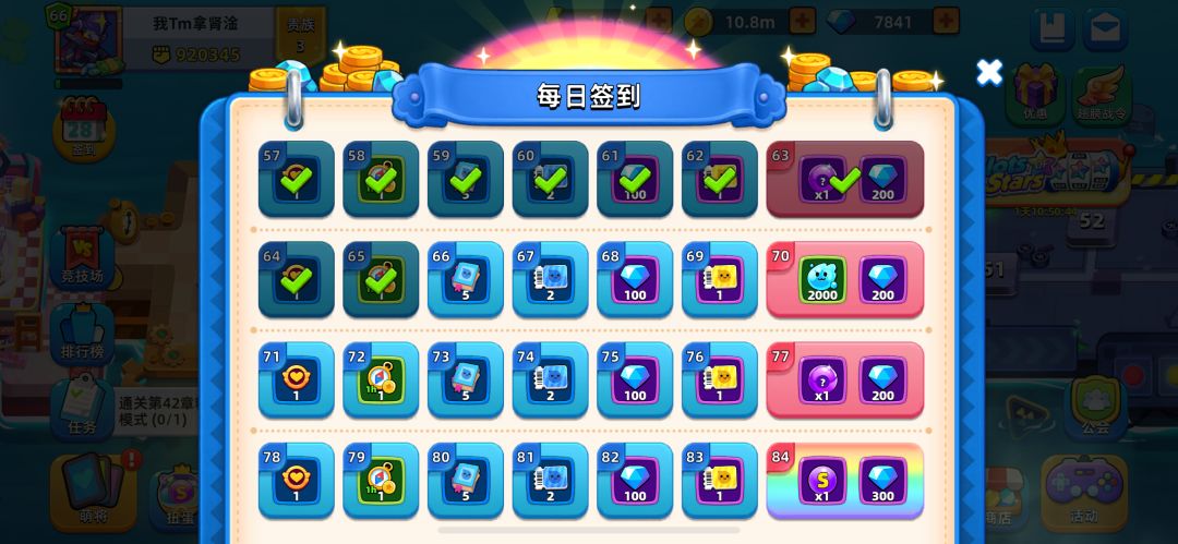 别的先不说兑换码必须给萌新安排一波~ mjzf000 mjzf666 mjzf777 mjzf888 mjzf999 我是昨天晚上十二点多下载的玩到了凌晨五点多,玩了上千款游戏,作为大佬下面是我总结的萌新攻略 攻略一:奖励 七日嘉年华和每日任务和成长任务:能做的全部都要做完,钻石奖励不少,能领到7000多的钻石奖励。重点哈:钻石留着不用去“皇家扭蛋机”十连抽,能保底两个史诗角色,这对萌新开始爬关卡