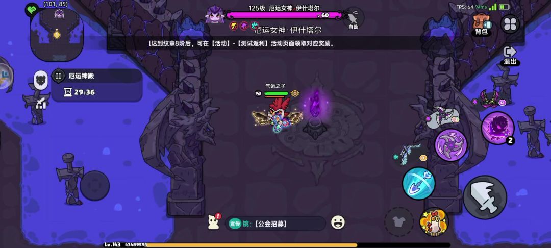 开服第三天了,想必大伙魔龙套装都已满星,也该刷蝙蝠套了,这是一个魔龙套连续刷boss不用动位置的办法。 角色推荐鸡哥容错率大,也可以选魔女配合加伤害,装备用魔龙之怒改造Y,配合蜉蝣可以召唤陨石。蜉蝣距离就55刚好可以碰到boss。 第一次进去地图是黑的,你得先打死boss地图才会亮。如图一找到这地方往右走6格,站第6格中间如图二(我这靠边了得往中间点) boss出来后不着急打先让子嗣碰你挂上印记后