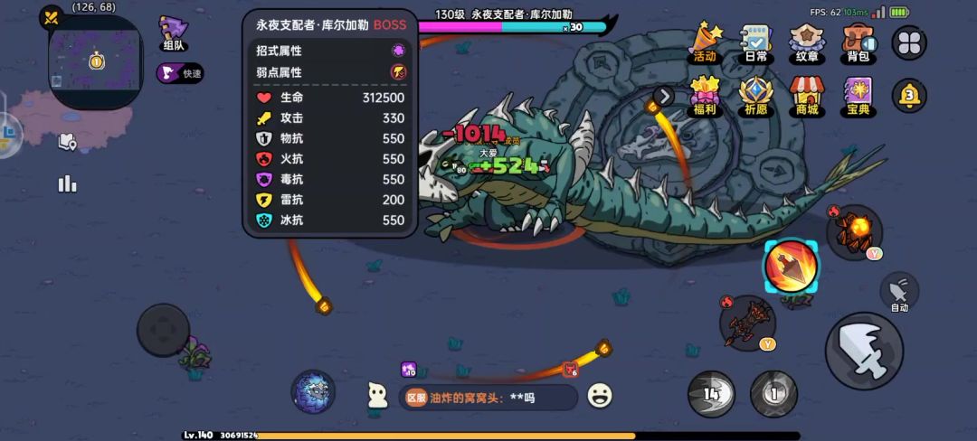 Boss名称:永夜支配者:库尔加勒 俗称骨龙 蜥蜴 Boss技能: 斩击:Boss挥动尾巴朝身体一侧造成180°的大范围斩击附带击退效果,不会被挂上标记。 咬击:Boss平a,对Boss脑袋附近造成小范围伤害,收到伤害的角色会被挂上标记。 招小弟:朝一个方位召唤小弟,小弟会到处乱窜,被小弟咬到也会挂上标记。 锁血:Boss有两个阶段锁血,第一个阶段时把附近所有没被挂上标记的角色拉进小房间打