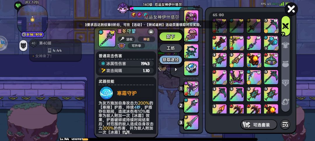 我这一套装备主要就是为了提升伤害,因为伤害低了后边时间不够,毕竟生命再高也是两下就死 (装备好的大佬可以根据自己的需求,来决定用什么角色、武器、装备) 角色:魔法师 武器: 毒飞镖:主要作用放技能补伤害(如果基础攻击高的可以换先祖指令) 冰杖:主要攻击武器(释放技能接普攻即可) 骑士王之誓:主要作用被动叠加攻击,打boss之前先等待攻击叠满(下边有图片) 装备: 蝙蝠套:(套装技能加攻击) 冥王项