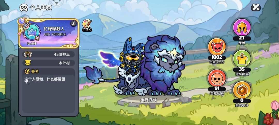 英雄介绍(第四期)vol.4:(因为英雄升阶难度极小直接展示满星效果) 1.兔耳游侠(外号兔子) (技能:闪电冲击) 召唤雷电覆盖身体,提升移速至上限且无视碰撞,对周围目标造成877点伤害,持续4秒。技能可储存2次。 被动:每提升1级移速+1。 新手前期武器推荐:风神之弓 死亡之吻 兔耳游侠跑路非常快,即使面对多人的围攻也可以迅速逃离,配合位移武器则是锦上添花。兔耳游侠也有完美的追击能力,无视碰撞