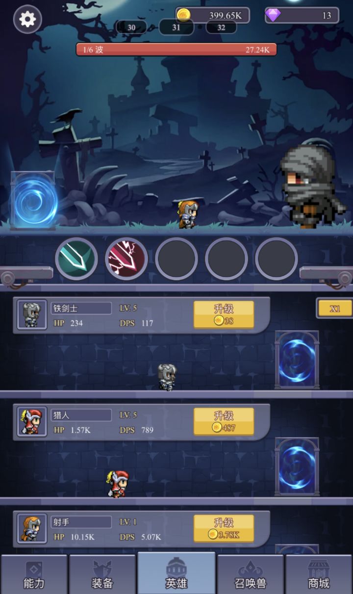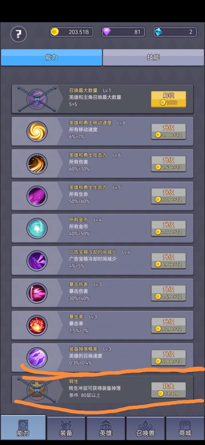 开局可以先看广告和钻石购买,六件装备。打怪掉落先别想了,需要“能力”升级。前面的英雄等级不用升太高,留资源后面开英雄。(资源主要来源依旧是广告,左上角的“宝箱”)#单机游戏#攻略
